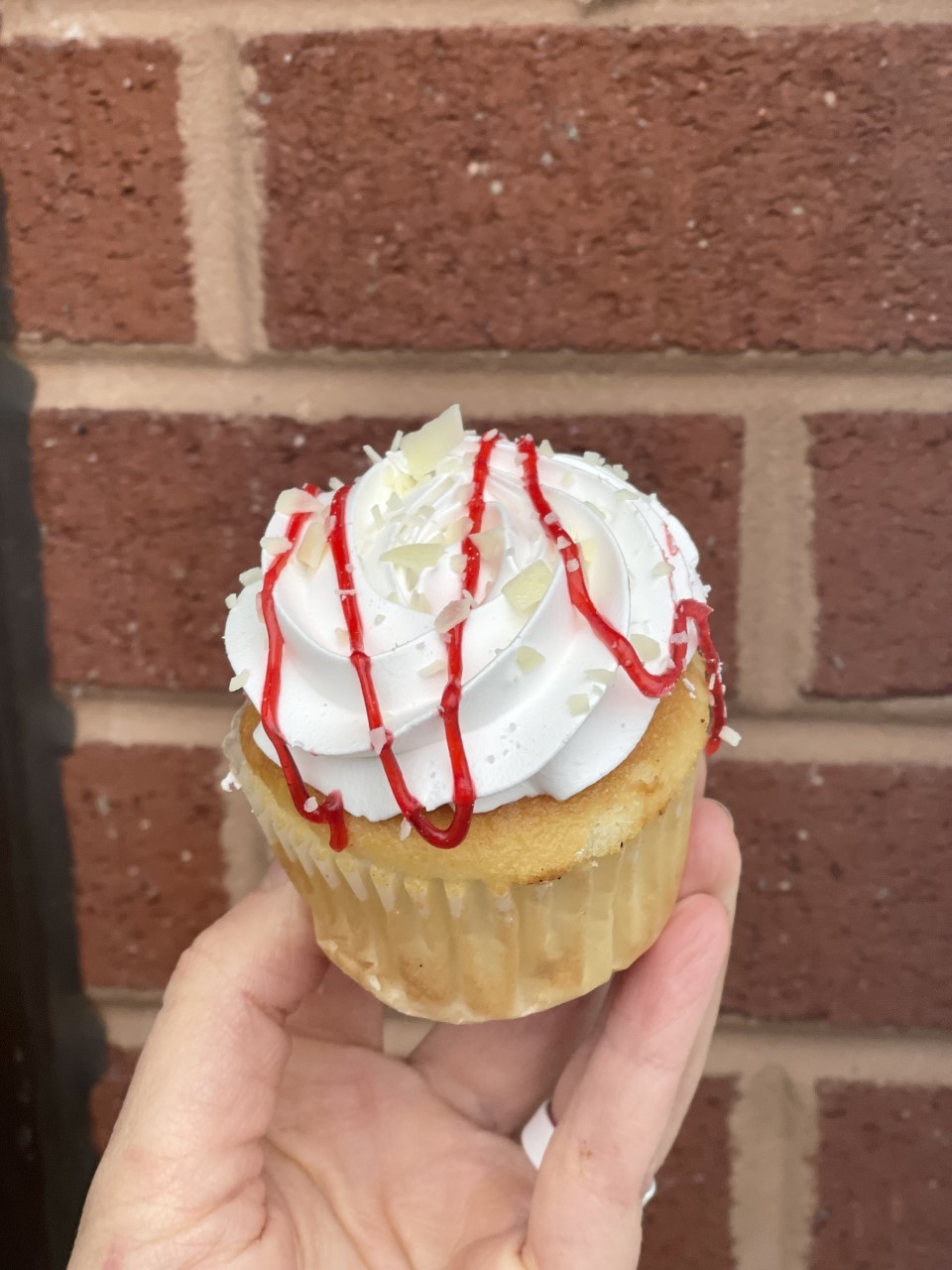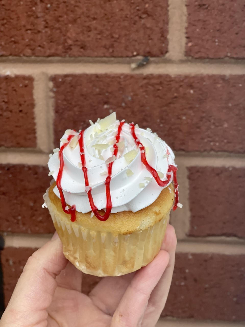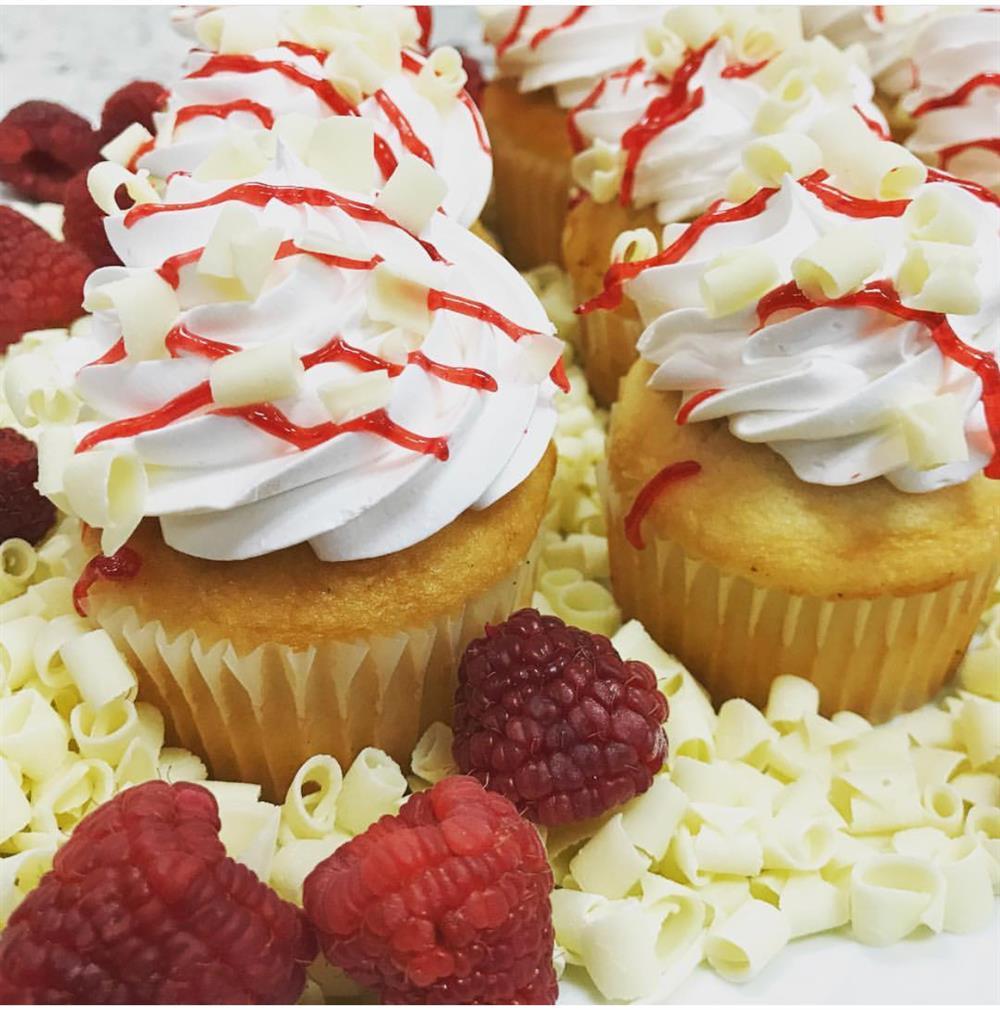 White Cake filled with raspberry filling, topped with a white mousse, and garnished with raspberry drizzle and white chocolate shavings.