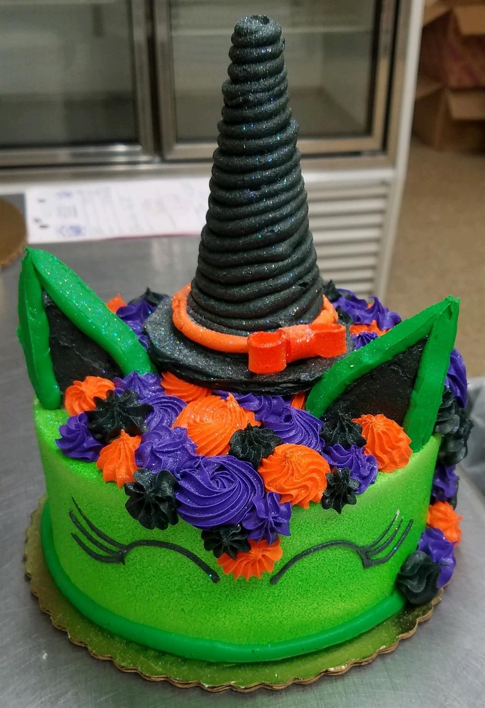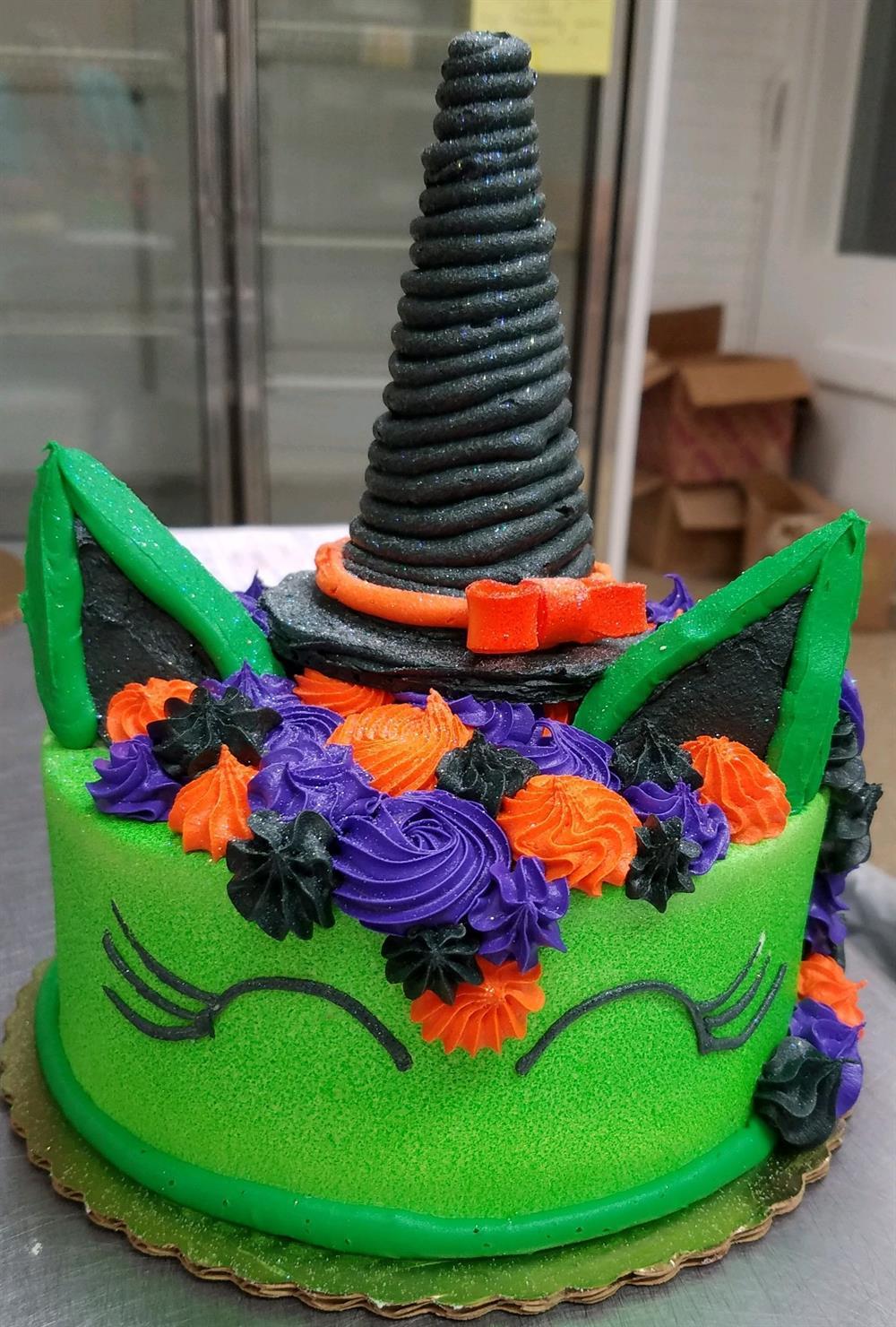 A halloween version of our popular unicorn cake design. An 8 inch cake, buttercream filled, and decorated with an ice cream cone hat, and ears. Serves 8-10. When ordering, please specify cake flavor - including: yellow, chocolate, 1/2 and 1/2 (layer of yellow and layer of chocolate), or Marble.