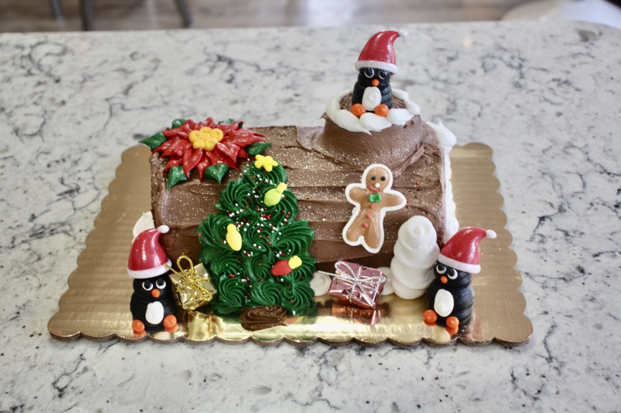 A chocolate cake roll, traditionally filled with raspberry and chocolate mousse, iced in chocolate buttercream to look like a log and decorated with a variety of different holiday styles. Please indicate decorations under order notes!